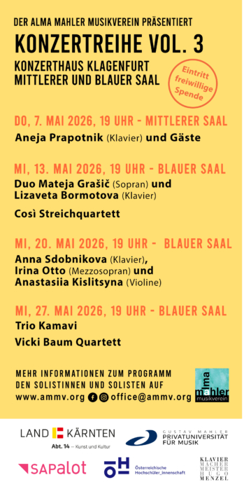 Die Konzertreihe Vol. 3 für Solo & Kammermusik bringt zwischen dem 7. Mai und dem 27. Mai 2026 an vier Abenden spannende musikalische Begegnungen in den Mittleren und Blauen Saal des Konzerthauses Klagenfurt. Beginn ist jeweils um 19 Uhr.
